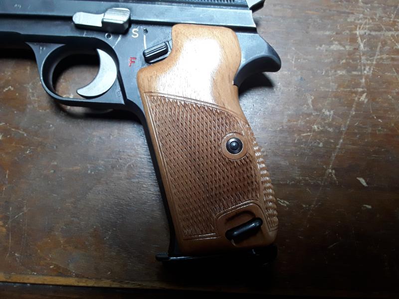 Cachas originales en madera para Sig P210. Son nuevas, la derecha en el envío la fisuraron, un armero muy bueno en culatas la encoló y ha quedado bien.