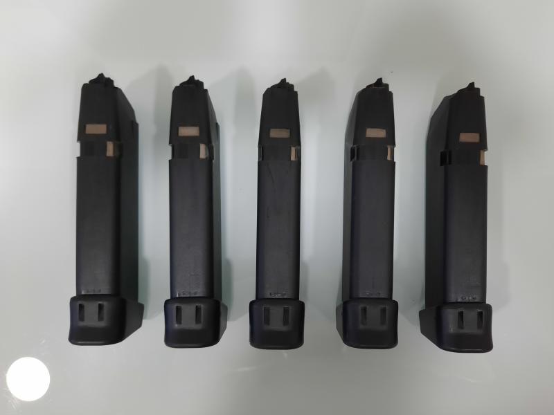 Se venden 5 cargadores glock originales para modelo 17, 4 GEN, con tacon +2, con muy poco uso y 01