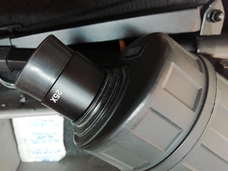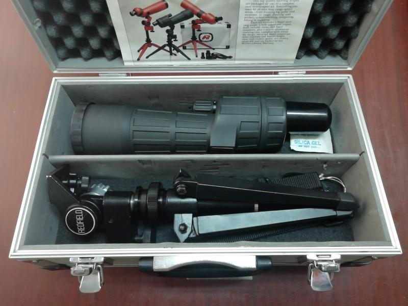 Telescopio de 60 mm, marca REDFIELD, fabricado en Japón, con ocular de 25X. Excelente óptica y robusto cuerpo metálico, con total revestimiento protector de goma. Tapas de ocular y objetivo.