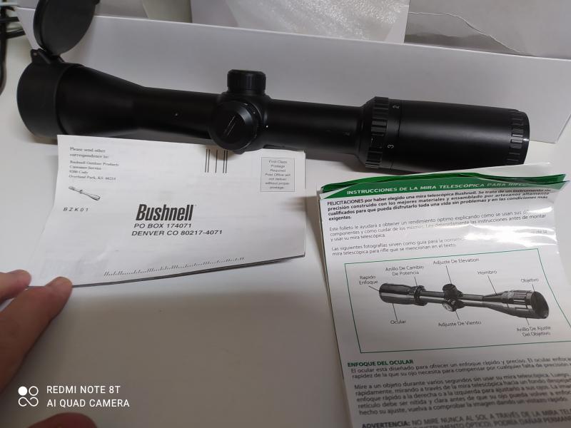 1- Visor BUSHNELL TROPHY XLT 1.5 - 6 X 42. Nuevo (Salió dos veces al campo) en su caja de origen, con sus instrucciones y demás. Tiene un problema y es que descarga prematuramente (en un par de semanas) la pila que hace funcionar el punto rojo. Es conveniente quitársela mientras no se usa para evitarlo. Precio 260 euros.