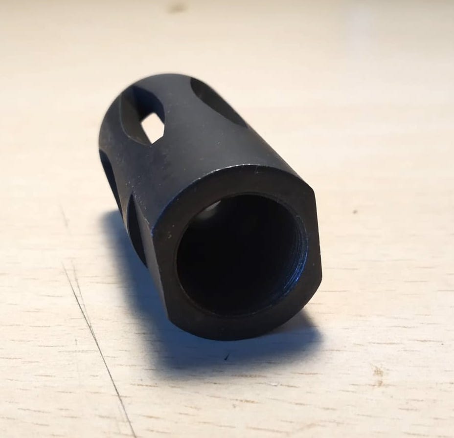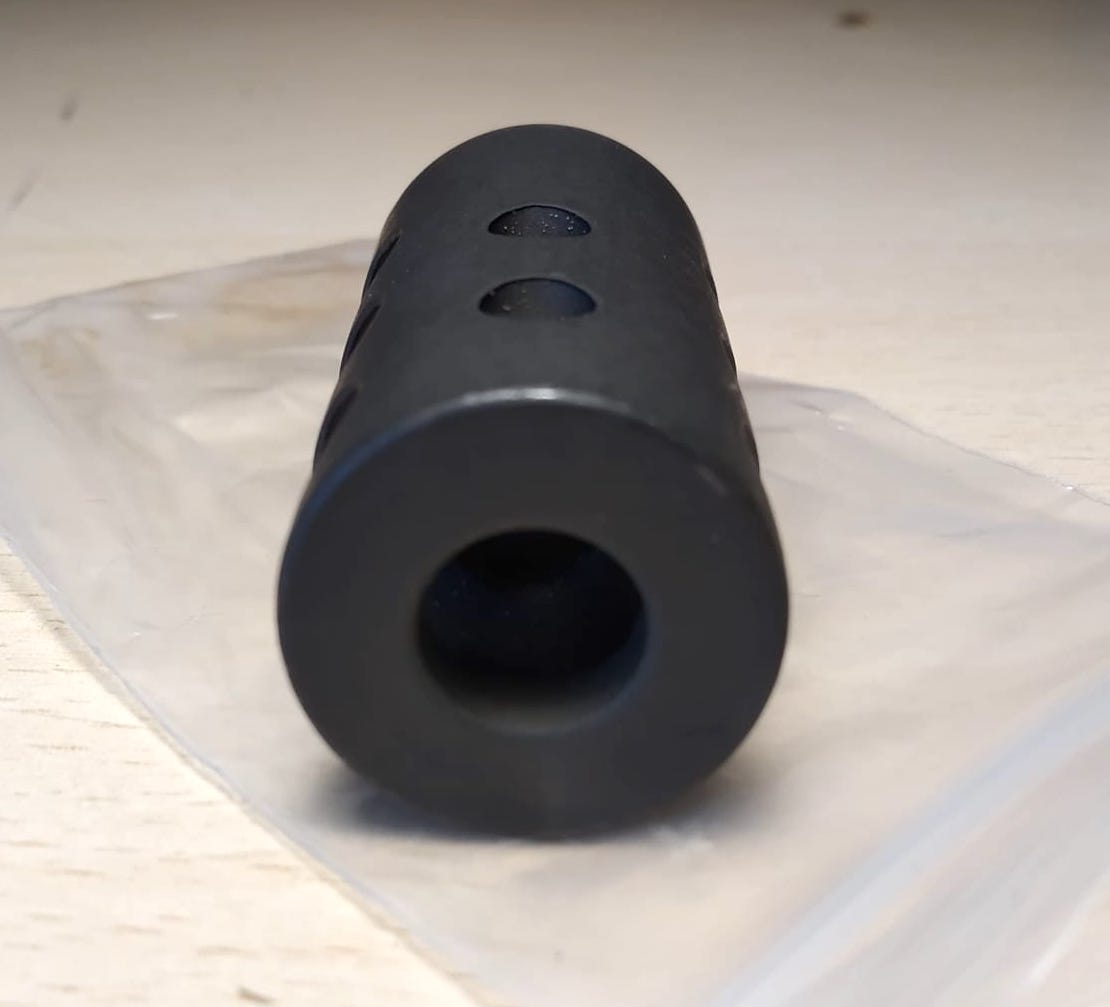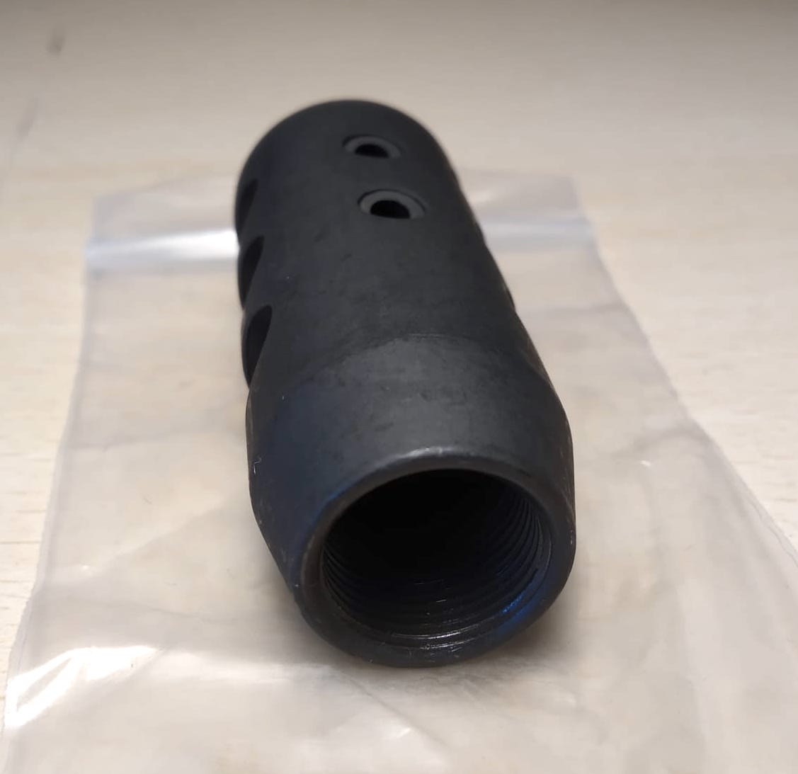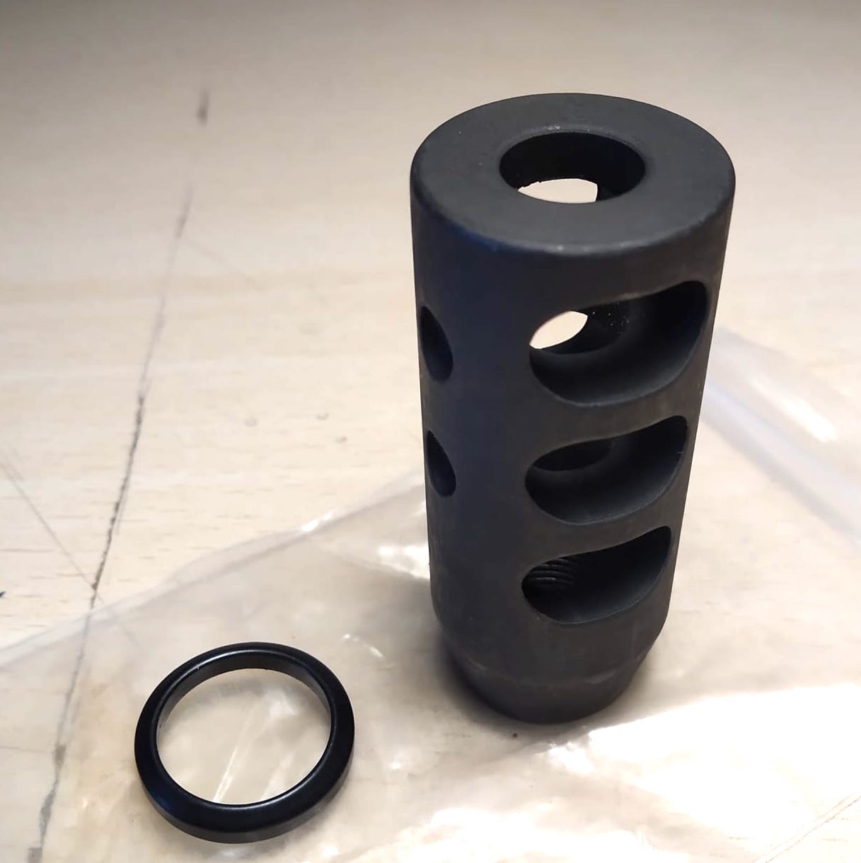 Me aparecieron por un cajón estos dos elementos que no uso y x tanto los saco a la venta. Se trata de una bocacha apagallamas tipo M16/AR-15 en estado nuevo, con paso de rosca 1/2x28, en acero parkerizado, normalmente adaptable a la mayoria de cañones del .22 (.223, .222, etc.). Por otro lado está el freno de boca con el mismo material y acabado, pero este en paso de rosca 5/8x24, para cañones del .30