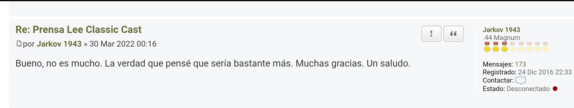 Mesillero escribió:Vendo conjunto de recarga compuesto por prensa monoestación de hierro Lee Classic Cast con sus empistonadores para larga y corta y con el sistema recoge pistones, juego de cacillos Lee para la polvora, graneador de polvora Hornady, empistonador automático completo para pistones small y large. más una bandeja negra de repuesto de pistones.