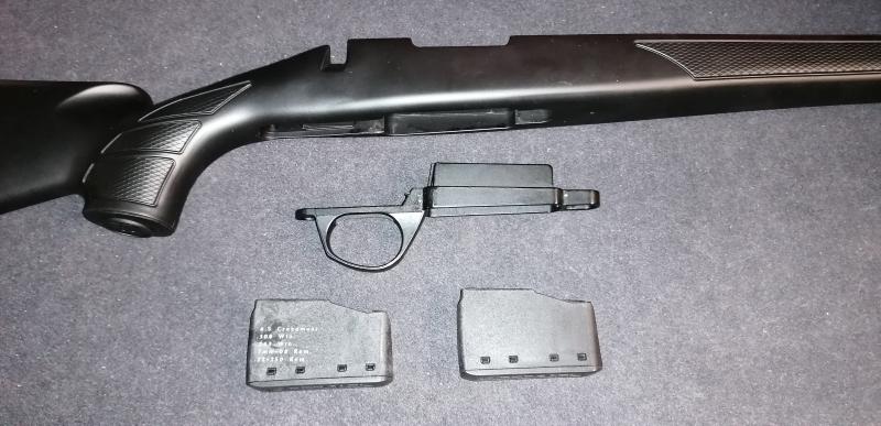 Guardamontes y cargadores válidos para pasar de sistemas fijos a extraibles y para todos los calibres de acción corta (SA) como el 243w, 6'5 creedmoor, 308w, 7mm Rem, 22 - 250 Rem. Culata y todo lo demás nuevo a estrenar, su precio de mercado está en torno a los 270 €. Lo dejo en 195 puesto en destino.