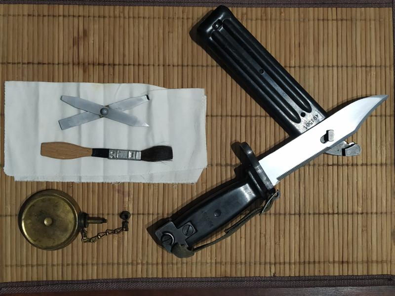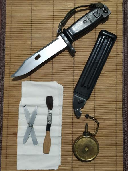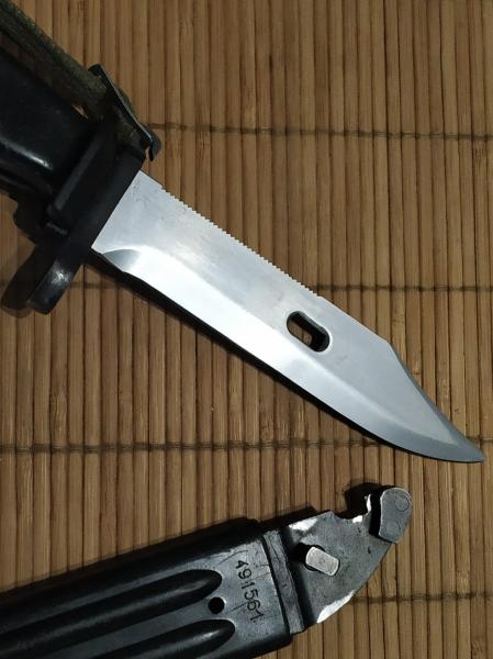 Bayoneta correspondiente a los fusiles yugoslavos modelos M 76 y M 70, mismo número de serie en machete y vaina (491561), hoja con filo original en perfectas condiciones así como la sierra, tiene función cortalambres, con fiador de mano.