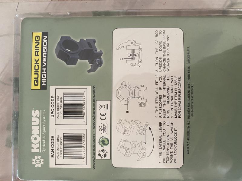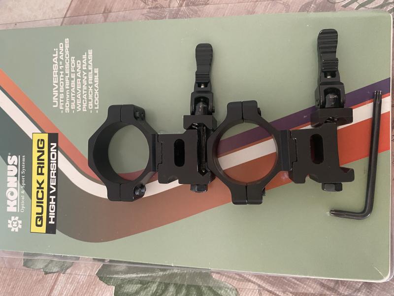 Anillas KONUS Quick Ring 30mm y 1" - carril Weaver - Altas para visores Quick Ring para visores con tubo de 30mm y 1" (25,4mm). Anillas desmontables para armas con carril Weaver, fabricadas en aluminio de alta calidad y resistencia. Altura: Altas. Costaron 75€ precio 35€ están en Madrid vendido