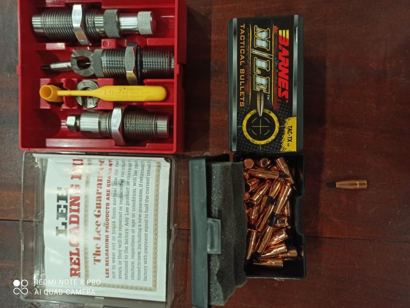 Buenas tardes, vendo con muy poco uso die lee del 300 bk. Galga con shellholder, dos cajas completas de puntas barnes vortx TAC 110 g. Y 15 vainas con 1disparo.