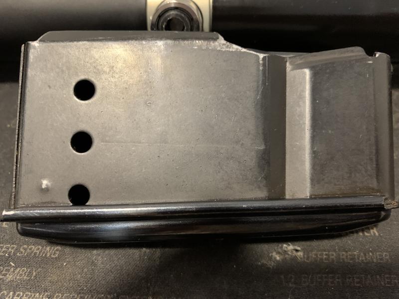 Olvidado en el armero, he encontrado un cargador de Sauer 3 balas calibre 7 mm Rem. Mag. Está en perfecto estado con alguna marca de uso.
