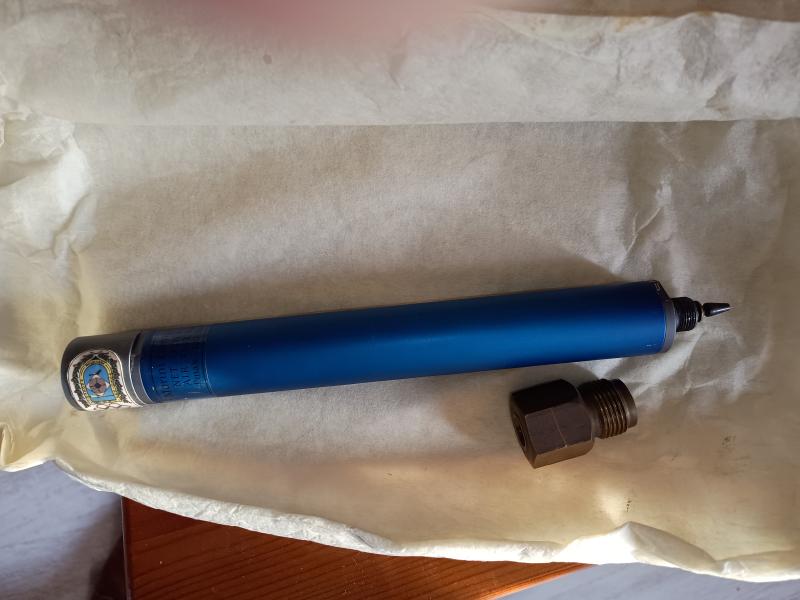 Es la botella y adaptador que se retiró de la pistola de Morini de Aire al transformarla para usar con botella convencional (de retirar para recargar). Esta se cargaba sin retirar de la pistola (con el adaptador).