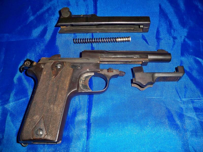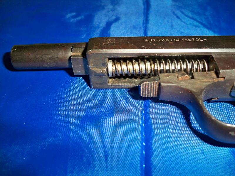 En esta primera foto se aprecia el desarme de la pistola así como un tetón que sobresale en la corredera, pues bien, en la guía del muelle hay un orificio donde entra el anterior.