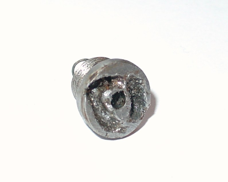 Se trata de la válvula Eder de escape de gases que va roscada en el plano de cierre y a través de la cual pasa el percutor. Su anterior propietario, parece que todo un manitas, debió tratar de desenroscarla sin quitar antes el tornillo de salida de gases, así que le practicó el bonito grabado que veis en la foto.
