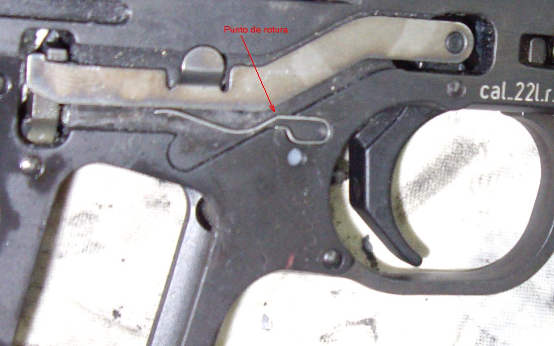 Tengo una pistola monotiro del calibre .22 LR bastante antigua, de principios del S. XX, a la que se le ha roto una de las piezas internas del mecanismo de disparo. En la imagen que pongo marco con un punto de color rojo la zona de la pieza en la que se ha producido la rotura (la de la imagen no se trata de la misma pistola, pero dicha pieza y el mecanismo de disparo de la mía son prácticamente idénticos a los del dibujo). Creo que esta pieza es de acero templado, aunque no estoy seguro de ello. La rotura tiene un aspecto escamado y las dos partes casan a la perfección. La superficie a unir sería bastante reducida, unos poquitos mm. (2 o 3), y no sería necesarío que la unión quedara con un aspecto impecable.