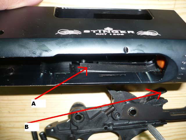 -1º Monta el conjunto disparador mas adelantado de su postura, ojo, aprieta un poco con un dedo la palanca marcada como "A" para que no se enganche la pieza "B".Cuando halla entrado le empujas al conjunto hacia la culata para colocarlo en su sitio.