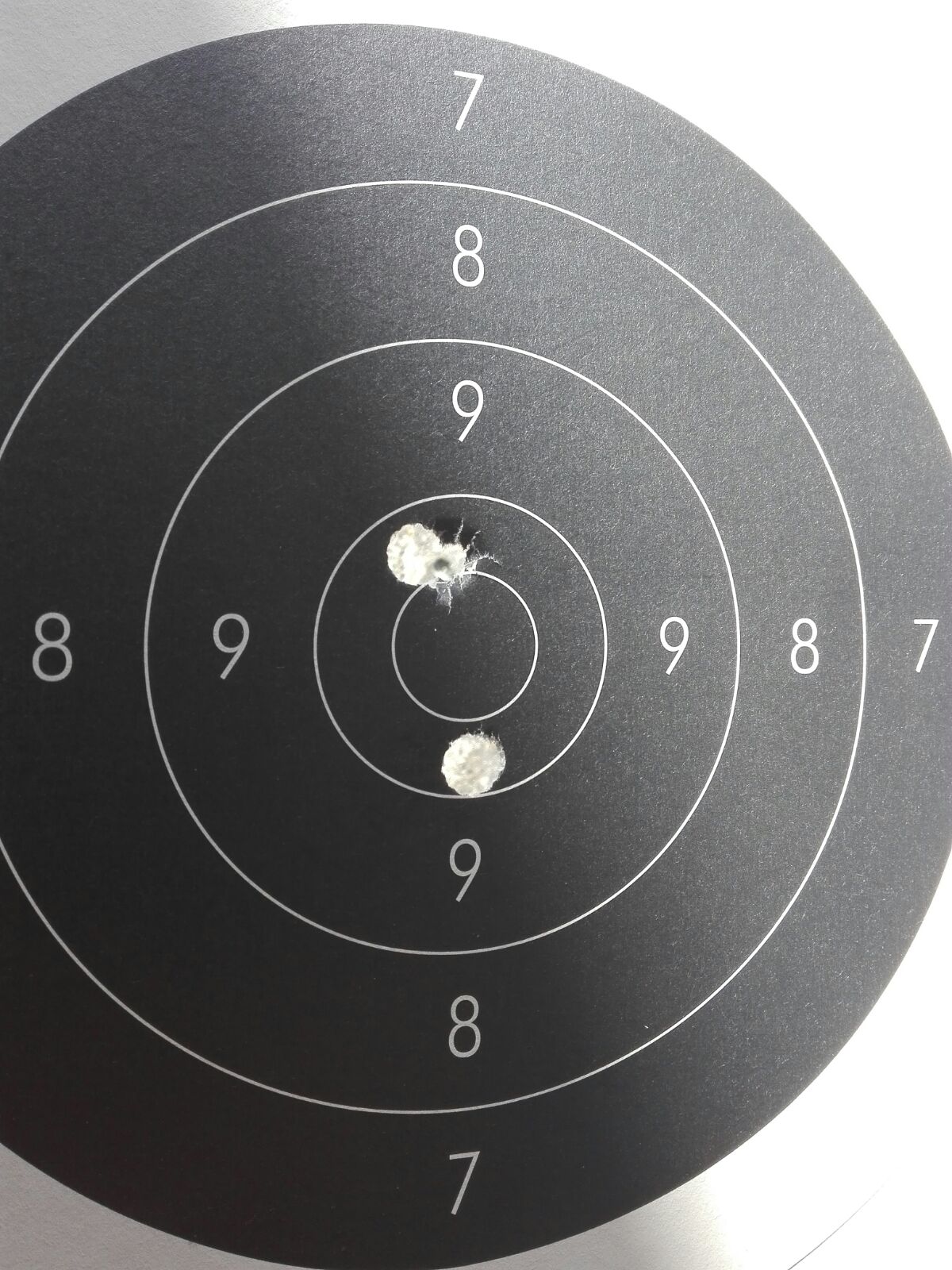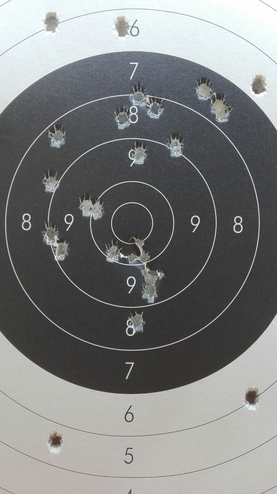 Con el corto le doy a los platos, colocados a unos 25 m. pero no lo he podido probar con blancos de tiro porque en Madrid no dejan usar la galería de 50 m. con ningún arma que no sea palanquera. He probado con munición comercial B&P pero no he probado aún con recargada