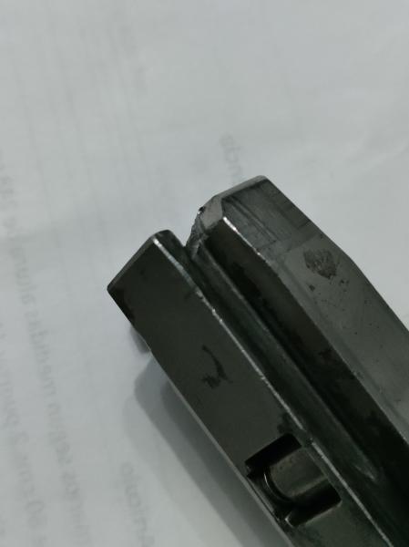 Pero esto no es lo peor....después, haciendo una inspección más minuciosa vi lo que parece un pequeño desgaste en la cabeza del cierre, creo que por golpear la palanca del cierre que lo sujeta.