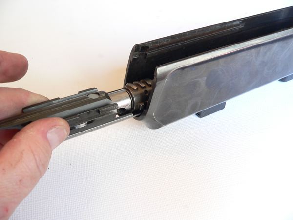 26.- Sólo haciendo coincidir riel del pistón con la espiga guía conseguiremos que el pistón se mueva atrás OJO a esto que es básico e imprescindible para el funcionamiento efectivo y seguro del rifle.