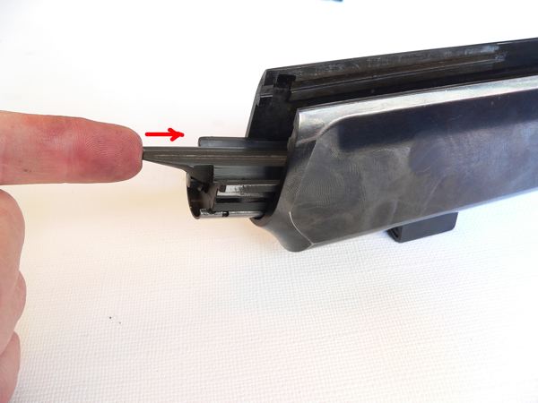 20 y 21.- Para reintegrar el cerrojo al cajón de mecanismos, ponemos el cajón (16) boca arriba, apoyamos en él el cerrojo y lo empujamos adelante. Así de sencilla y suavemente volverá a los rieles por los que se desplaza.