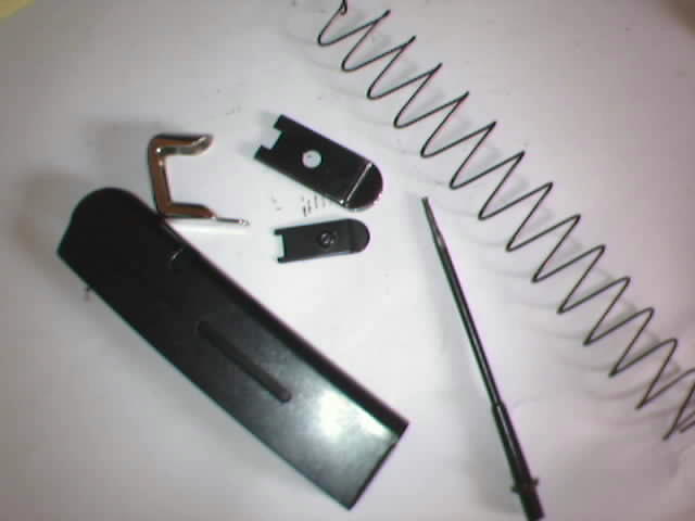 Los cargadores que no tienen tapa inferior, se desmontan comprimiendo el muelle empujando la teja bloqueamos el muelle introduciendo un botador por la ranura inferior y dejando caer la teja sale posteriormente el muelle