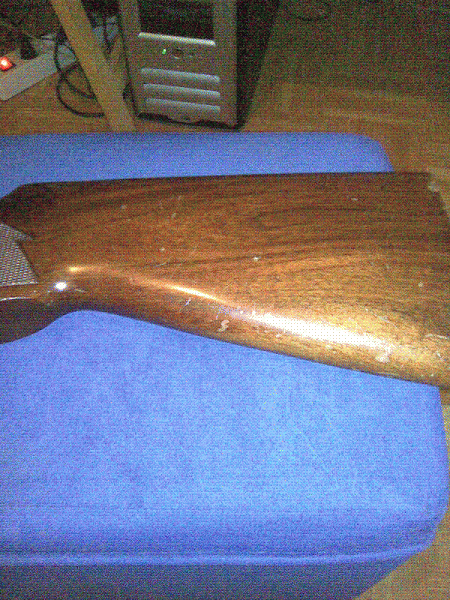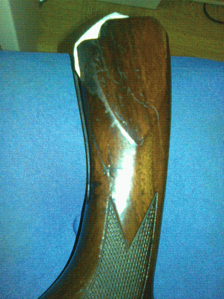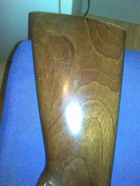 Como te digo, aún está con su barniz, tengo que andar comprando los materiales, a ver si te hago fotos de como está la culata (el guardamanos lo tiene mi "chache", para arreglar unas cosillas-percutores-y ver como han quedado, es que a mano no puede montarlos y sin guardamanos el cañón se separa de la báscula). Ahora te hago una foto de la culata, está con su barniz, pero verás los rayazos que tiene.