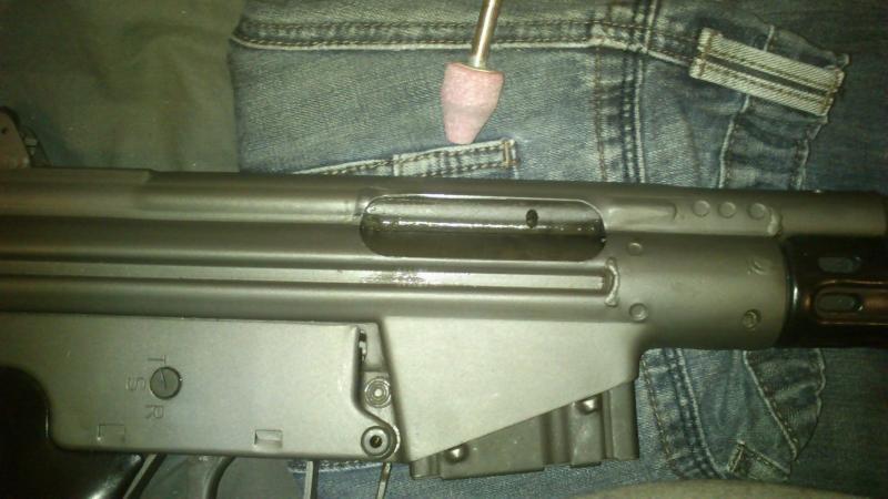 Supongo que algunos ya lo habreis hecho, si teneis cargadores del G3 para el cetme y os dan problemas para sacarlos pulsando el boton y/o la palanca de retenida del cargador teneis que rebajar un poquito con lima o dremel la zona donde encaja el cargador justo donde señalo con la dremel, con un poco que le deis va el cargador como la seda