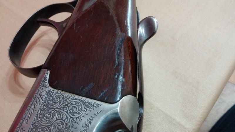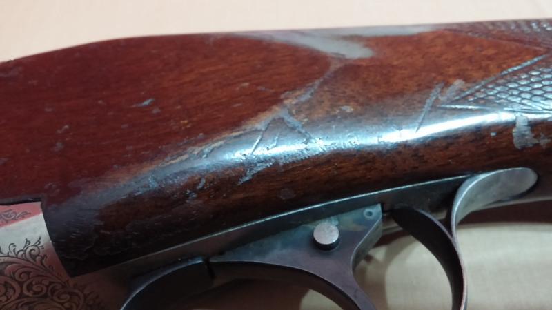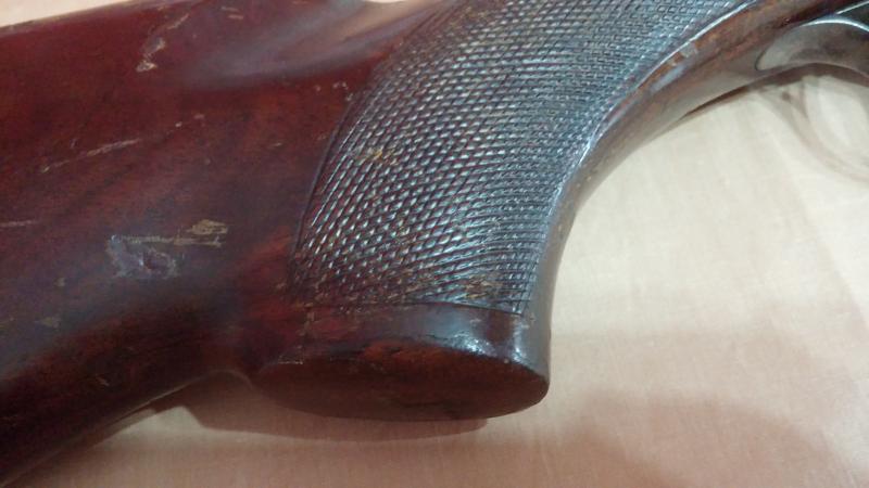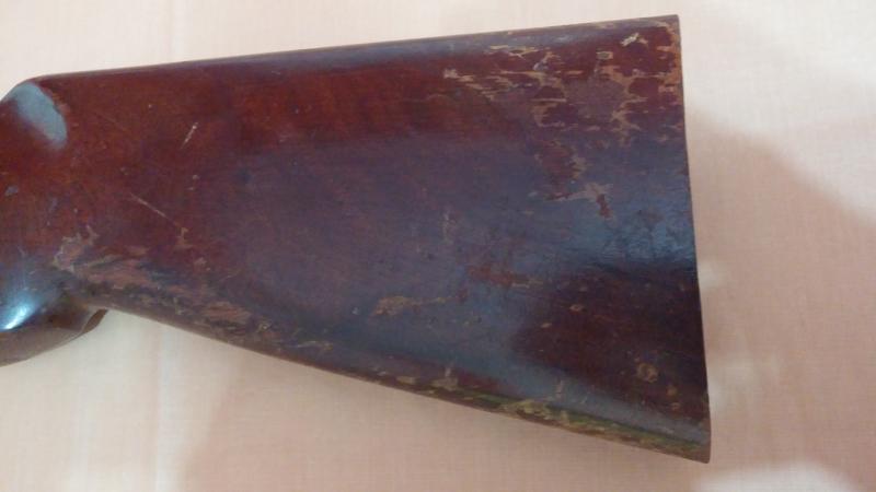 Mecánicamente muy bien pero tenía roña en los cañones para parar un tren. Las maderas estaban fatal: el barniz totalmente desconchado que además oscurecía y tapaba las vetas de la madera. La culata estaba particularmente dañada. Raspones y golpes habían literalmente arrancado algunas partes superficiales de la madera.