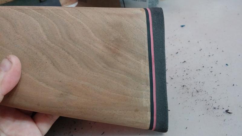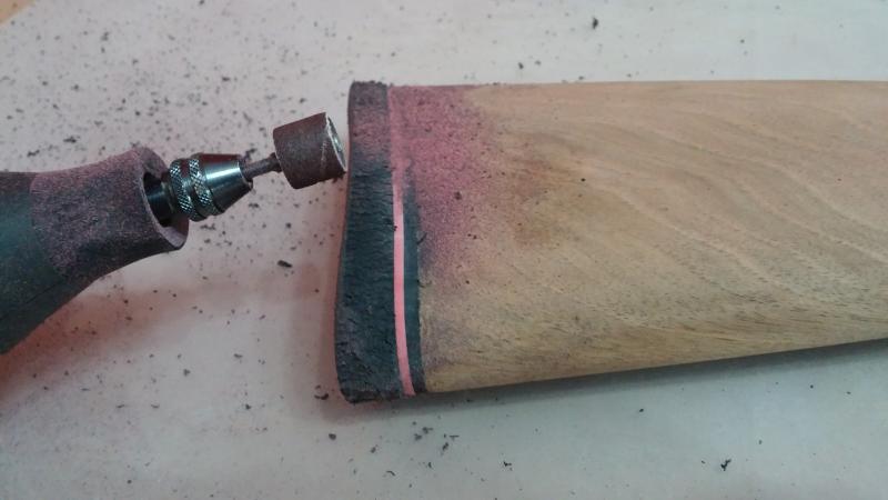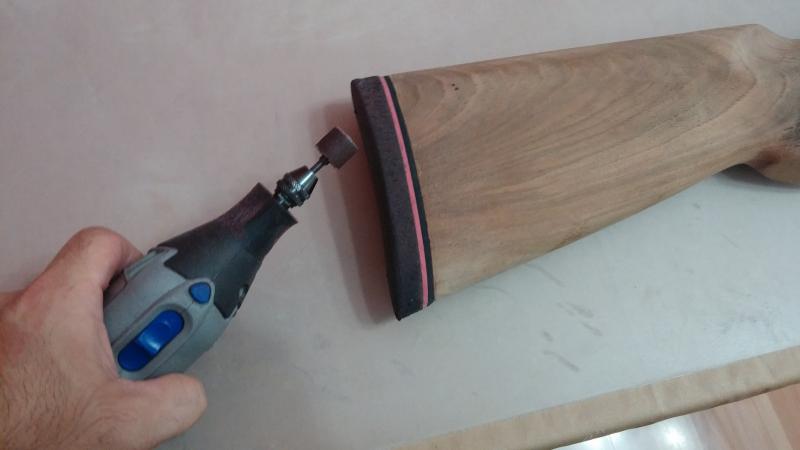 Una vez lijado todo pensé que para un torpe como yo, igual era buena opción meterle mano a espinoso tema de la cantonera en este momento, con la madera "pelada". Os lo explico: las cantoneras suelen ser "universales", esto es, cuando la presentas sobre la culata suelen sobresalir por todos lados ya que tienen un tamaño superior. Ahora llega el reto de lijarla con mucho cuidado hasta dejarla con la medida exacta para que si pasas el dedo no se note el salto de la madera a la goma. Evidentemente hay que ser un fiera para conseguir esta finura (o un profesional, claro). La Dremel hace maravillas pero hay que tener muy buen pulso porque si se te va un poquito y le das a la madera fastidias el barniz o el acabado.
