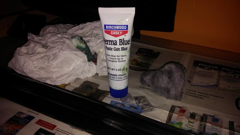 Para el nuevo pavón me decidí por un pavón frío. Al final, tras mucho vichear por el foro, me decanté por el Perma Blue de Birchwood Casey. Ya sé que no es excesivamente resistente (eso dicen en todos lados) pero también es verdad que la escopeta va a estar guardada en la funda y ocasionalmente pegando cuatro tiros en una cancha de tiro al plato. Así que me puse manos a la obra. Lo único que hice fue seguir las instrucciones del fabricante. Nada más. En mi armería no lo tenían líquido sino en crema. Es igual. El resultado y la aplicación son los mismos.