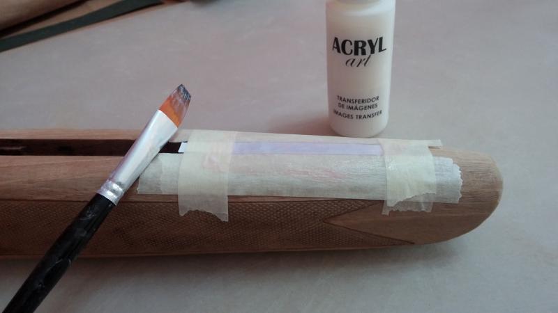 El procedimiento habitual es que se pone el folio con la parte impresa mirando a la madera, se fija con cinta y se le da por la parte de fuera con el líquido. Este traspasa el papel, separa la tinta de él y la hace "caer" sobre la madera dejando fijada la imagen que había en el papel previamente. Ya os digo yo que es verdad. El resultado es fantástico, fácil y rápido. Pero...
