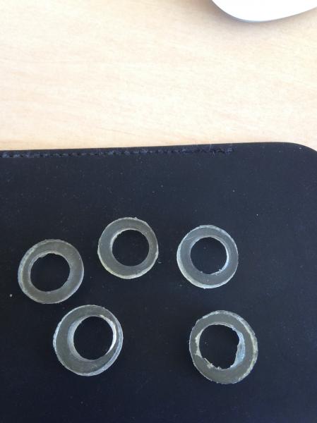 Para cortar las arandelas ( hacer los agujeros ), con unos cinceles sacabocados debería bastar, pero lo que no sé es de qué material hacerla. Qué tipo de plastico/goma debería usar?