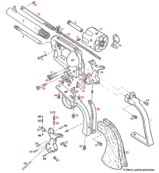 Por otra parte, el sistema de acción simple del revólver Remington 1875, es exactamente igual al del Colt SAA...solo que con un eje menos.