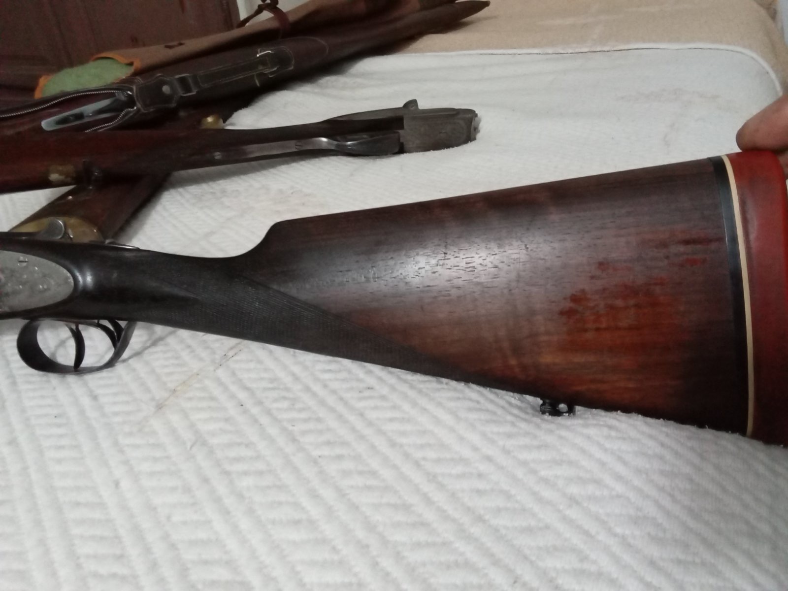 Notese en esta escopeta como la parte que ha retenido barniz orginal, mantiene su tono nogal, mientras que la parte que lo ha perdido, el barniz, a la cual aplicaron generoso aceite de linaza, esta practicamente negra, y es irrecuperable, pues le han dado tantas manos, que no recupera color lijando.