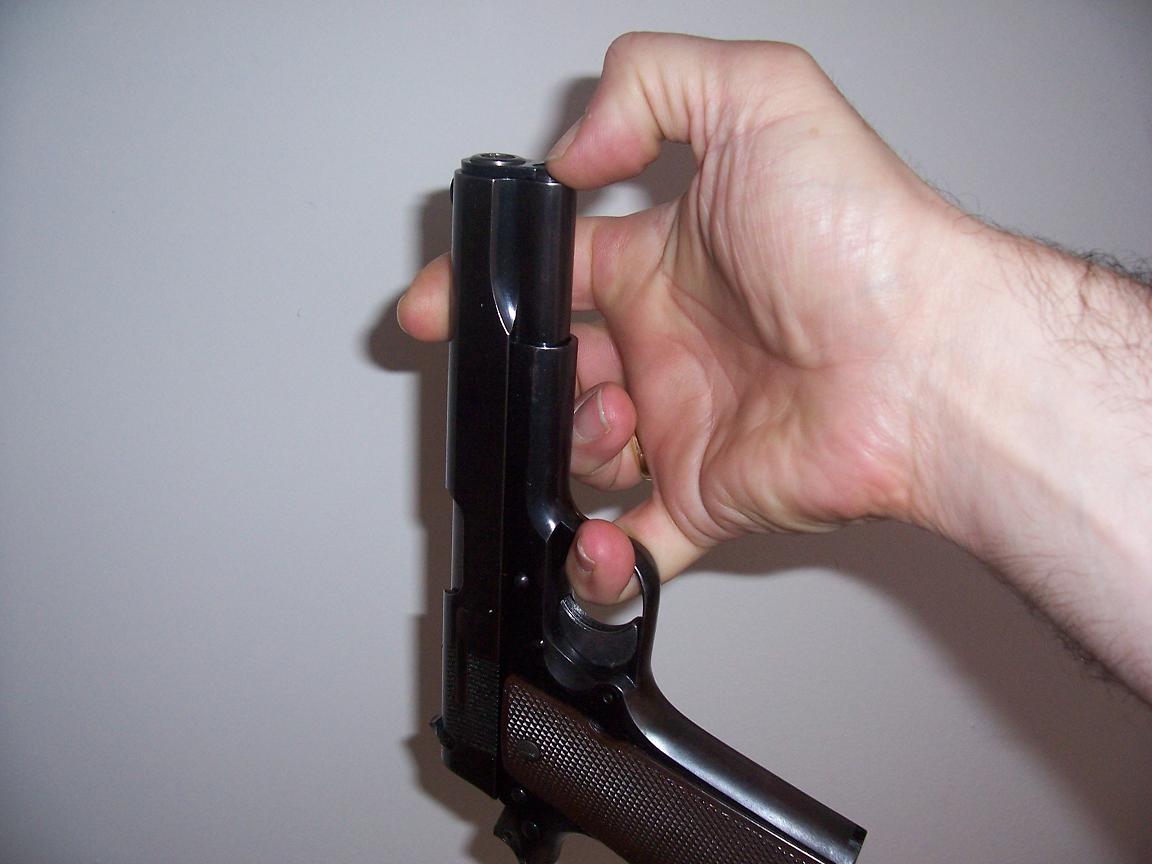 Presionamos el tapón espoleado con el pulgar sosteniendo la pistola por el guardamonte con el meñique.