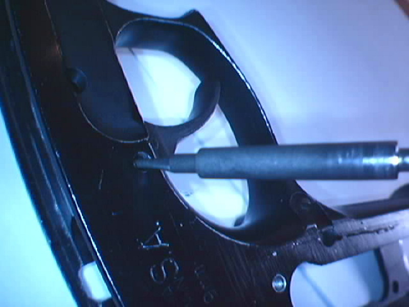 Empezamos presionando con el eje de la retenida de la corredera el tetón inferior de la casete de disparo (Backstrap)