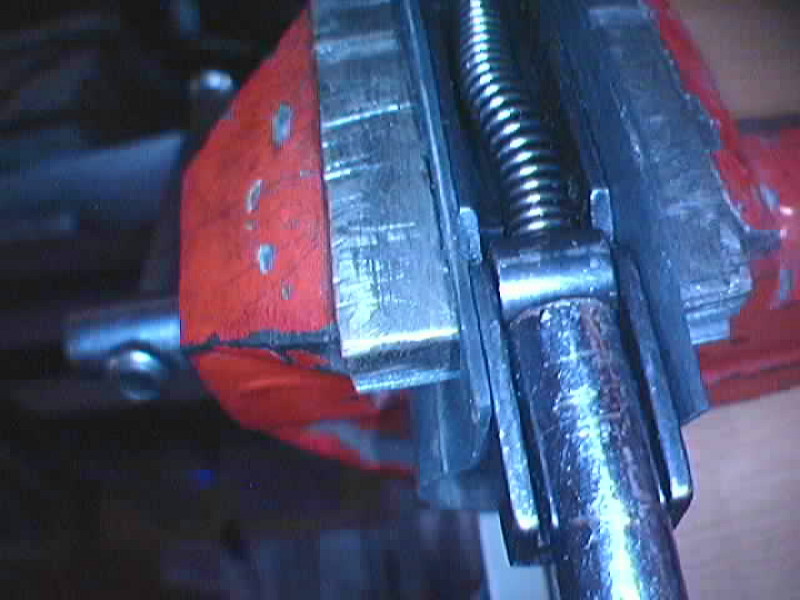 Sujetamos la casete con un tornillo de banco (protegiéndola con una goma de bicicleta por ejemplo), empujamos con la herramienta de manera que el eje del muelle real del martillo se introduzca en ella hasta que sacamos el tope del muelle de sus guías (mejor tapar con un trapo el muelle para que el tope no salga disparado)