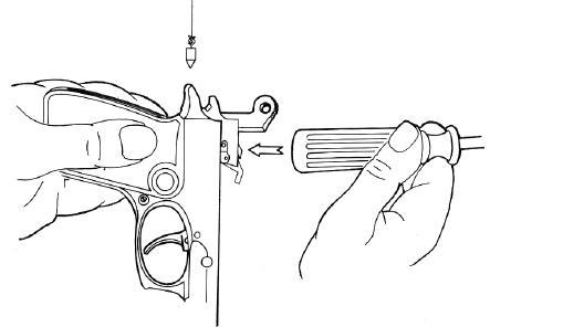 Con la aguja percutora presionamos el lado derecho del eje del disparador y sacamos este por la izquierda