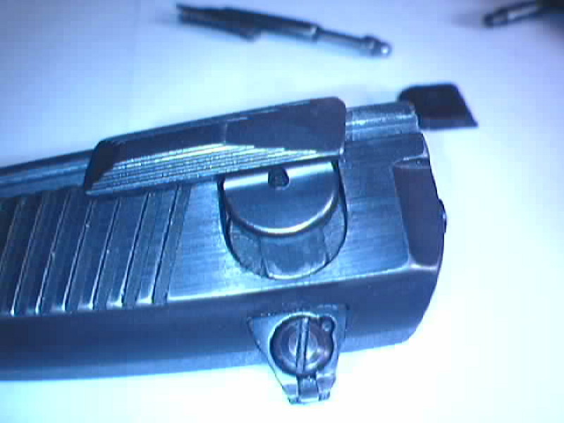 Con esto tenemos desmontada por completo la corredera, la mira no la vamos a tocar, pero saldría empujándola con un botador desde el costado derecho.