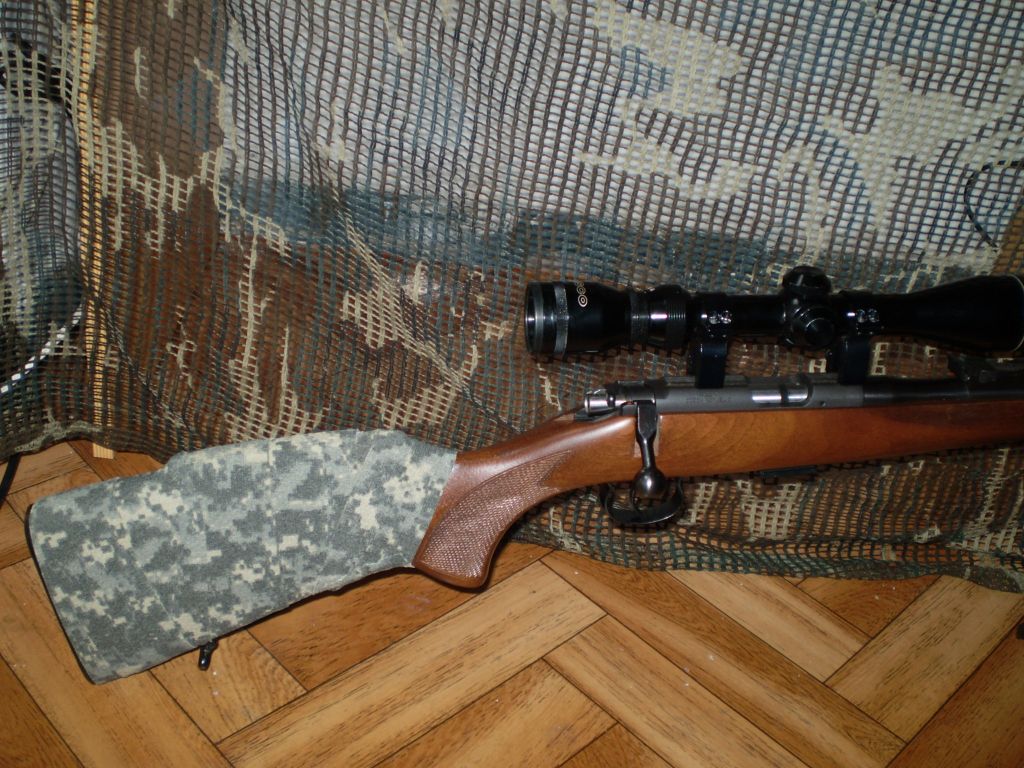 Tiene anillas altas y era necesario subir la culata, para lo que acople un trozo de banda espumosa adhesiva y la consiguiente banda mimetizada, que vende algun compañero por aqui.