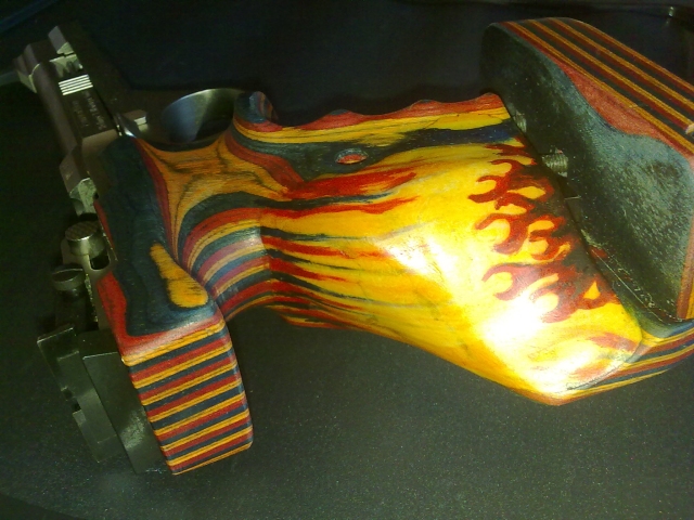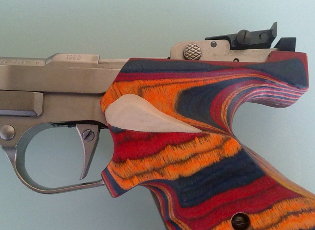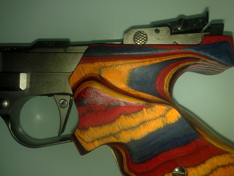 Despues de extender la masa en la parte interesada , empuñe el arma para que esposara bien mi mano , quite antes de endurecamiento lo gordo de lo que sobraba ... el resto , una vece bien seco y duro , lo trabaje a la lima , y papel de lija.