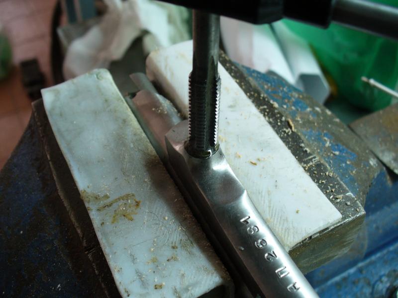Para roscar he usado un juego de machos de métrica 8, a los que les he recortado la punta ya que de lo contario no se podría hacer rosca hasta el fondo del agujero.
