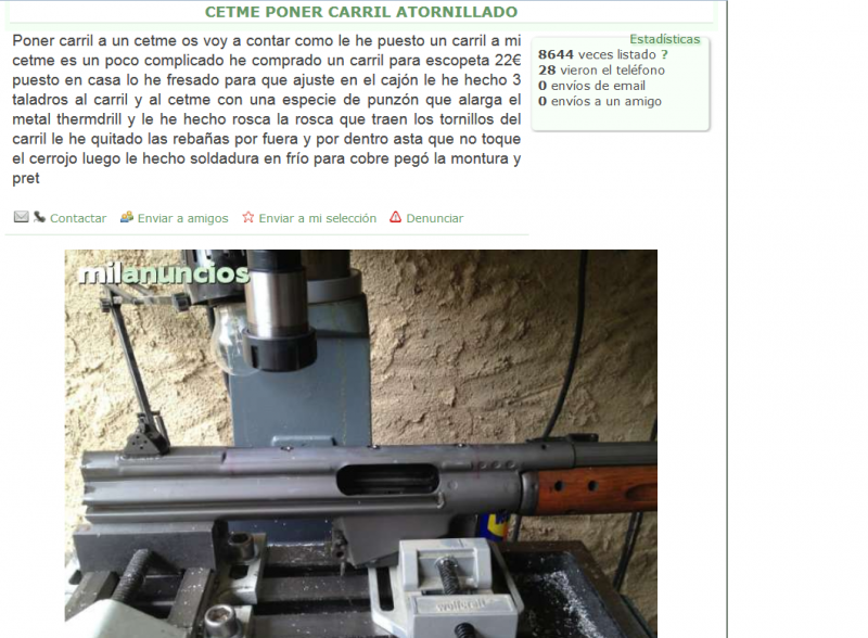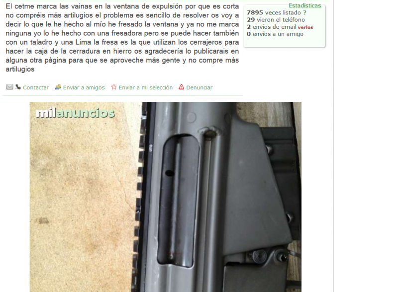 2º para el tema de las vainas, algo importante pq son caras y no hay, he pensado en "abrir" un poco mas la ventana para que no choquen contra el armazon pq viendolo detenidamente el problema es que el cerrojo tiene mas recorrido hacia atras y la vaina sale mucho antes golpeando el armazon. no me gusta el deflector pq lo veo algo churro y antiestetico, alguien ha intentado esto? lo vi en milanuncios y no prece mala idea, no andara por aqui el autor por casualidad?