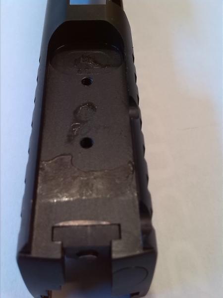 En la foto se ve resto del pegamento de fábrica así como marcas de haber arrancado hasta el pavón del sitio del pegado.