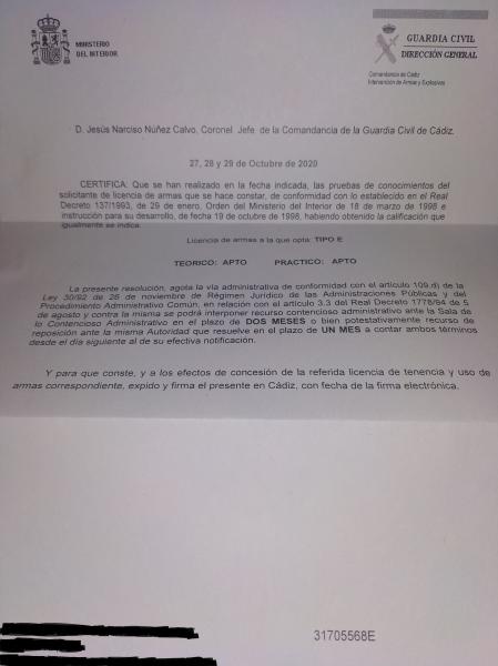 elmenda2003 escribió:yo diria que todavia no has solicitado la licencia, eso sólo es el resultado de la prueba de tiro y examen, yo diria que ahora tienes que solicitar la licencia, adjuntando ese certificado conforme has pasado la prueba, junto con la otra documentación que sea necesaria: certificado médico, acreditación del pago de tasas, instancia solicitando la licencia, etc etc