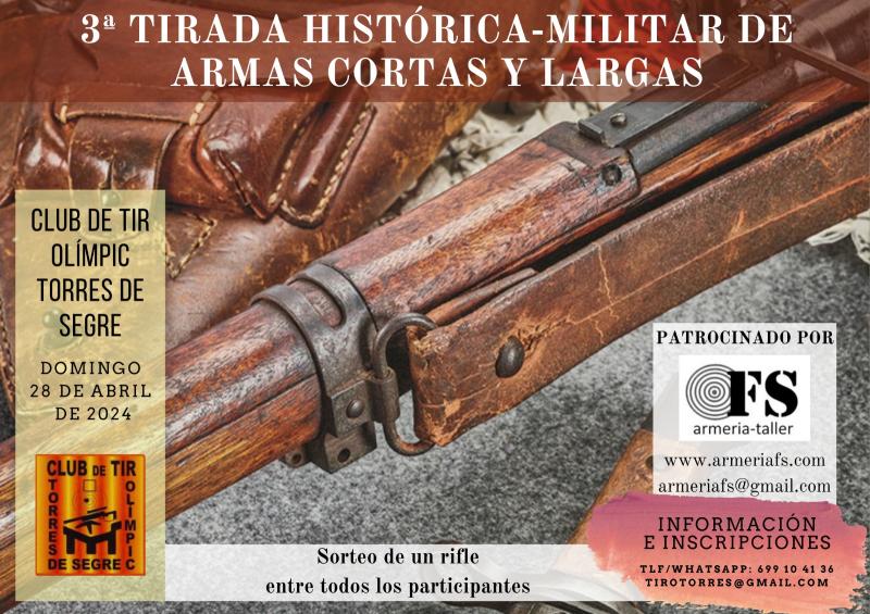 Despues del exito de las dos ediciones anteriores el proximo 28 de Abril celebraremos en el campo de tiro de tiro de Torres de Segre la 3ª tirada con armas historico-militares. Cortas y largas. Cortas a 25 m. y largas a 50, 100 y opcionalmente a 200 m. para los mas atrevidos. Con almuerzo de hermandad despues de la tirada y sorteo de un fusil historico-militar entre todos los participantes entre otros regalos. Precio: 35 euros con el almuerzo incluido.