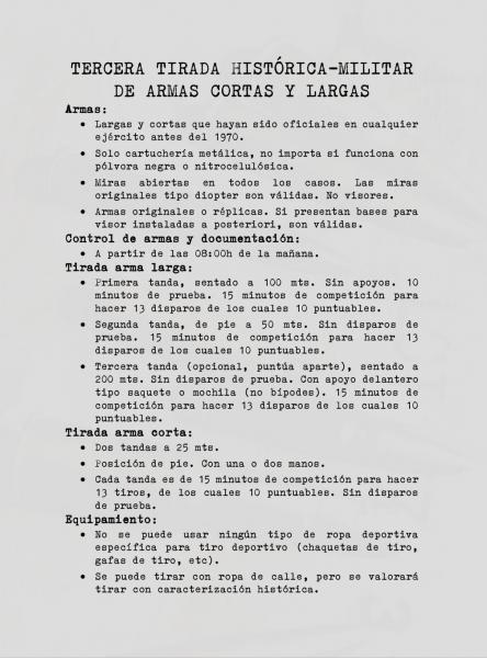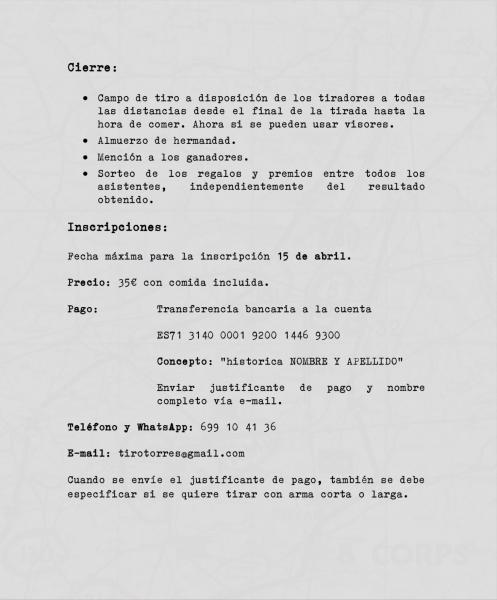Hola, tal como habeis podido leer, las armas largas i y cortas tienen que haber servido en algun ejercito antes de 1970, de cartucheria metalica con polbora nitrcelulosica o negra . Avancarga no. Originales o replicas exactas y miras aviertas. En caso de originales con diopter original tambien son aptas. Bisores no. Sorteo entre todos los participantes de un fusil historico, de momento no conozco el modelo, el año pasado fue un carl gustav m63 con diopter original. Tirada y almuerzo por 35 euros, otras consumiciones a parte. La tirada es con fusil a 50 y 100m y opcionalmente a 200 m. Arma corta a 25m. Se puede apuntar para tirar a largas y cortas por el mismo precio de 35euros. SALUDOS.