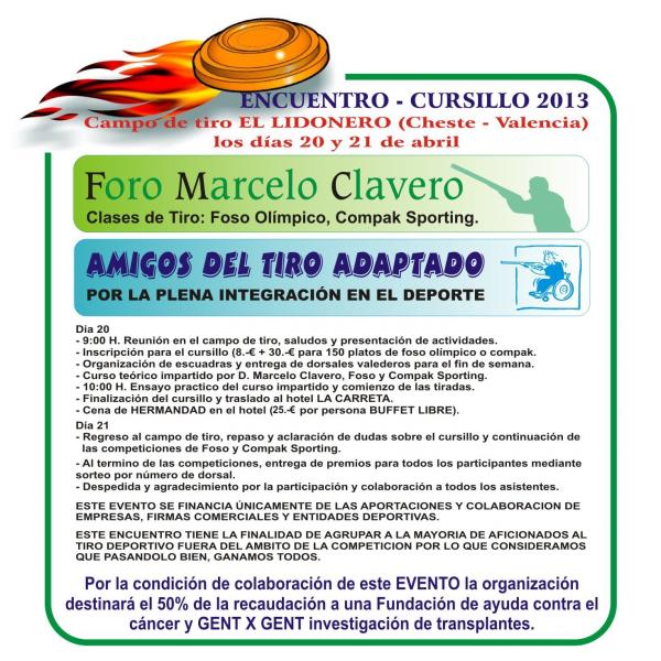Hola amigos, con vuestro permiso publico el programa del encuentro cursillo que realizarémos en Cheste (Valencia) los días 20 y 21 de abril de 2013, tiro al plato, compak y foso, además lo que recaudemos irá a la Fundación para la investigación contra el cancer y Gent x Gent de investigación de trasplantes.