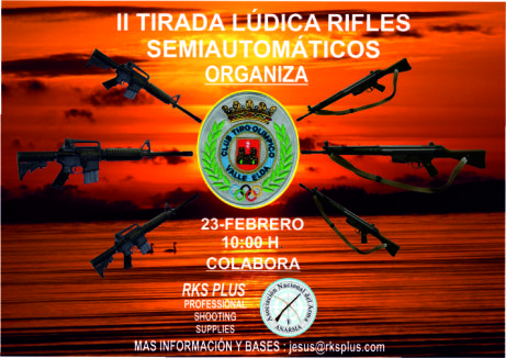 El próximo día 23 de Febrero a las 10:00 H. celebraremos la II Tirada Lúdica para rifles semiautomático en el Club de TIRO OLIMPICO VALLE DE ELDA, dicho evento se va a realizar gracias a la colaboración del citado CLUB y la empresa RKS PLUS, con la inestimable colaboración de ANARMA.
