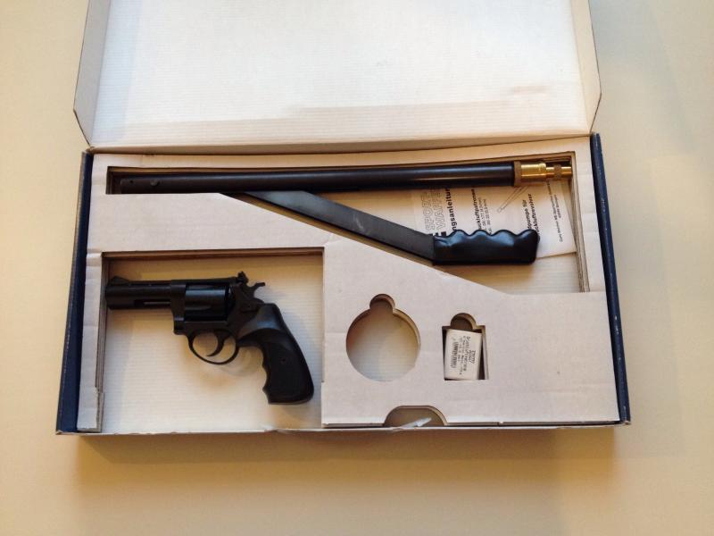 Revolver ME 38 Magnum, sistema BACS, calibre 4,5mm, color negro. Con bomba de carga y seis cartuchos de 4,5mm. En venta por 160€. Portes no incluidos.