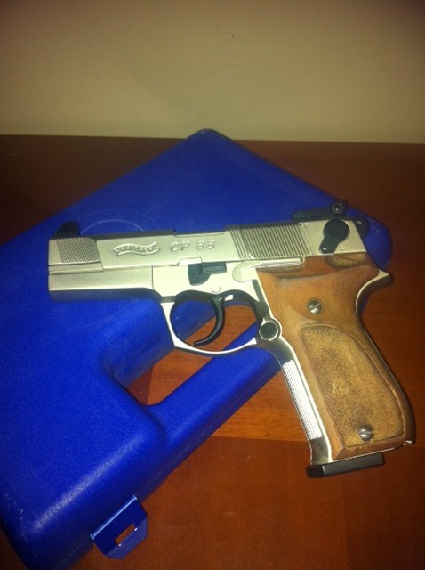 Vendo pistola CO2 Walther CP88-4" en niquel-madera Cal.4,5. Incluyo grupo de puntería micrométrico y 3 cargadores extras, además de los 2 cargadores originales, dentro de su blíster. Esta arma sólo ha sido usada para probarla ya que se compró como colección, no para su uso. Su precio es de 210€.