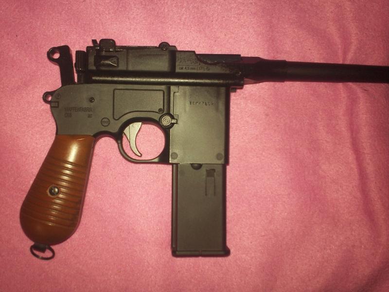vendo pistola Mauser C-96 cal 4.5 BB de Umarex,la corredera retrocede en cada disparo para montar el percutor,cargador con capacidad para 18 bolas de acero,solo he gastado 3 capsulas de co2,esta impecable ecepto por el plastiquito que cubre la parte interior de la palometa que aprieta la capsula de co2,se partio y la cubri con nural,no se nota y no afecta para nada a su funcionamiento,la entrego con 2 capsulas de co2 y biberon de bolas BB de acero de la misma marca,ademas con caja de madera con esquineras y cierre dorados y acolchado interior