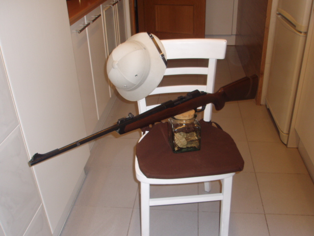 Pero lo que enamora de ella , es sin duda, su linea... belleza clásica se mire por donde se mire. La mia (dispongo de otra unidad, que envejecí con sumo cuidado, dando betún de judea a la culata y usando la técnica del pincel seco, de modelista, para metalizar las partes de plástico) la tengo colgada de la pared con un visor metálico antiguo y una correa porta fusil, logicamente de piel.