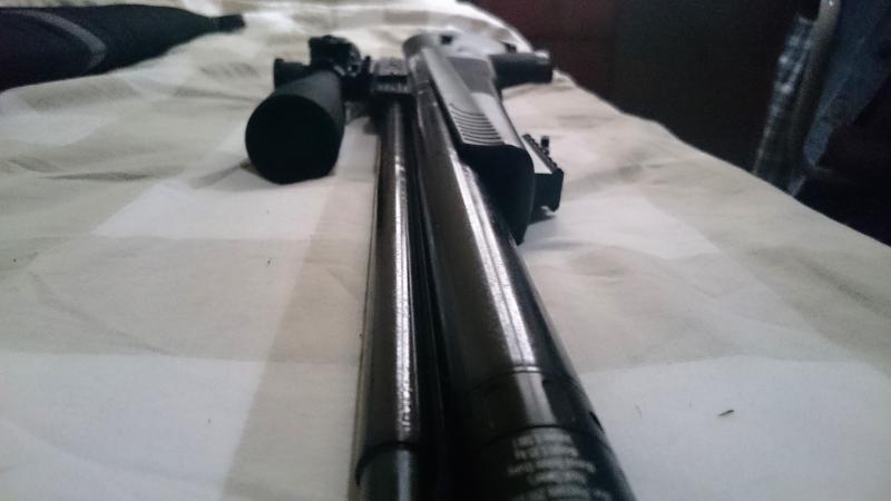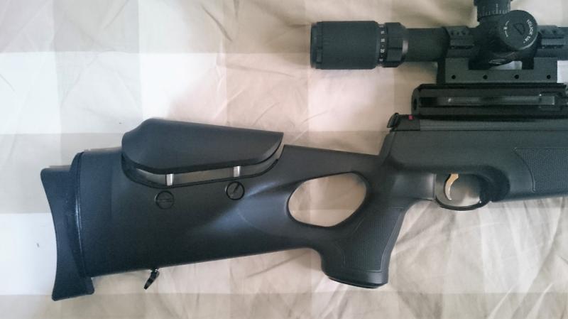 tiene la culata sintética top, regulable, y dispone de doble rail para montar visor, de 11 y 20 mm. Adjuntaría factura para poder darla de alta en el ayuntamiento (500€), boquilla de carga deposito PCP, 4 cargadores rotatorios de 10 balines, miras abiertas y el ocho (desmontados en las fotos) aparte de regalar munición JSB y juntas tóricas por si en un futuro fuera necesario el cambio.